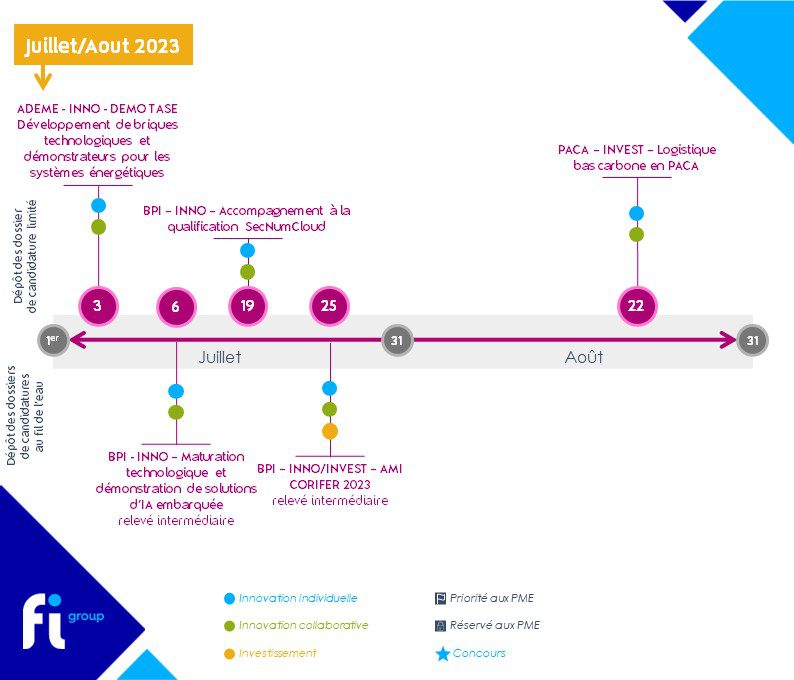 Découvrez le calendrier des aides publiques à l’innovation et à l’investissement des mois de Juillet et Aout 2023. Nos experts en stratégies de financements publiques en R&D réalisent tous les mois un travail de simplification des aides disponibles. Celles-ci comprennent les aides disponibles dans le cadre des programmes de relance économique proposés par le Gouvernement (PIA 4, France 2030, etc.). Vous trouverez ci-dessous les appels à projets ouverts au cours des mois de Juillet et Aout 2023.